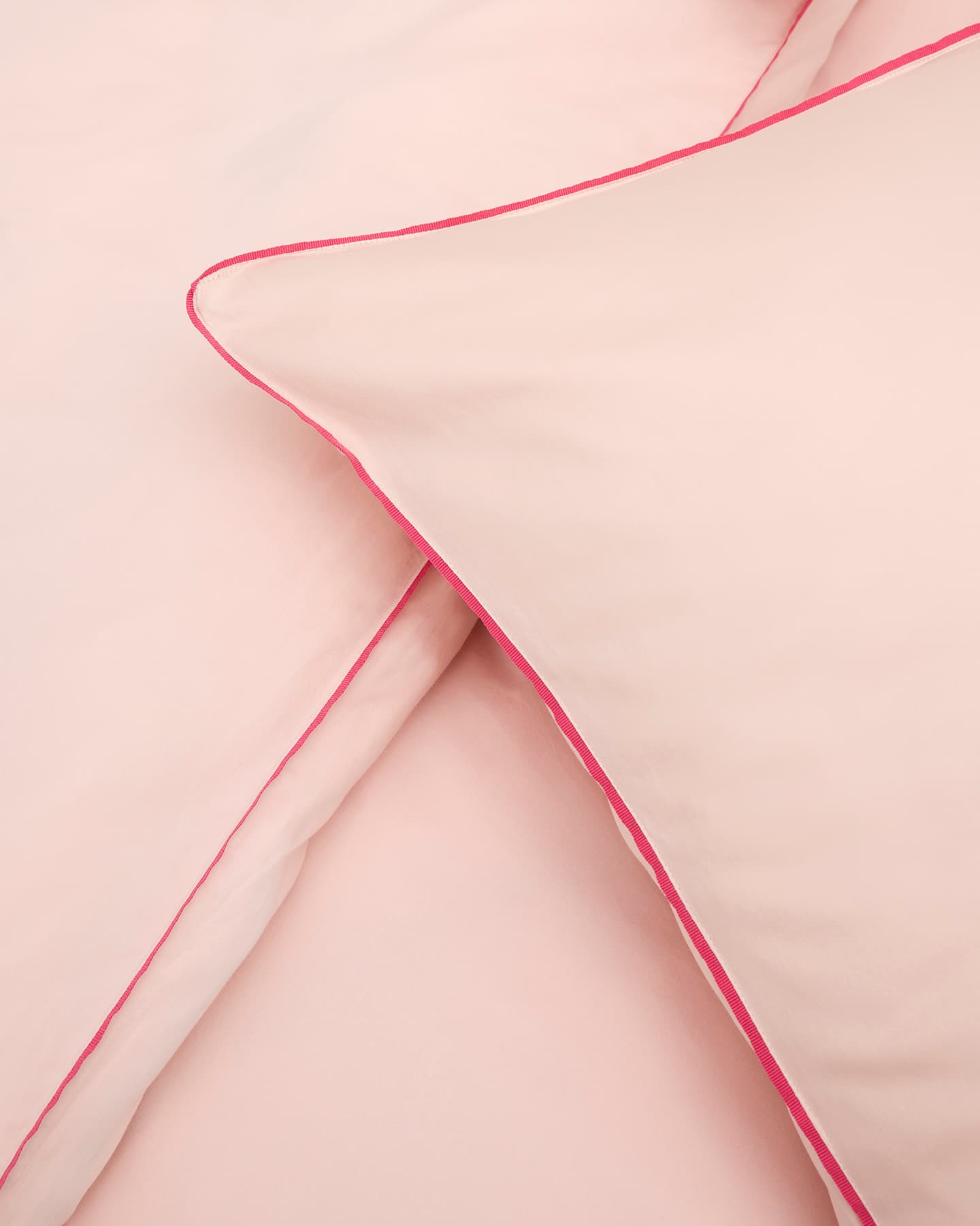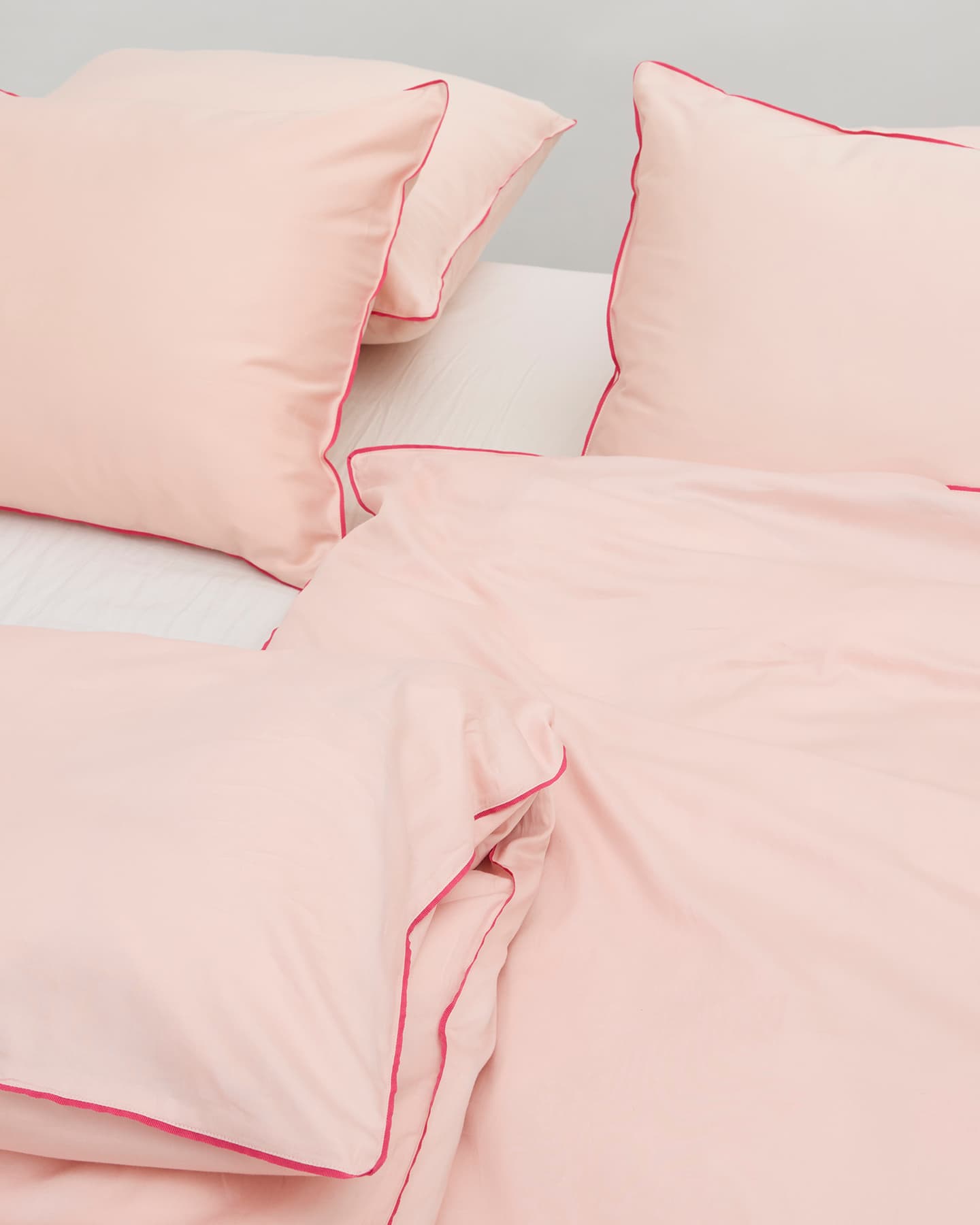 Strimma har en tunn passpoal i cerise runt påslakan och örngott som är handsydd av erfarna skräddare. Passpoalen är gjord av återvunnen polyester. Tyget i satin skapar en mjuk och följsam känsla med vacker lyster.