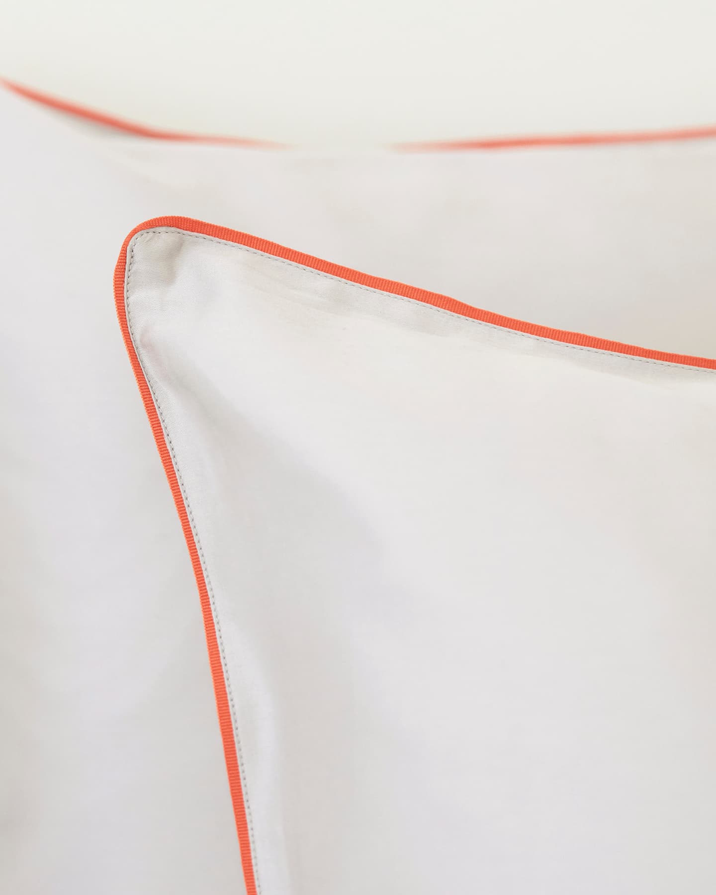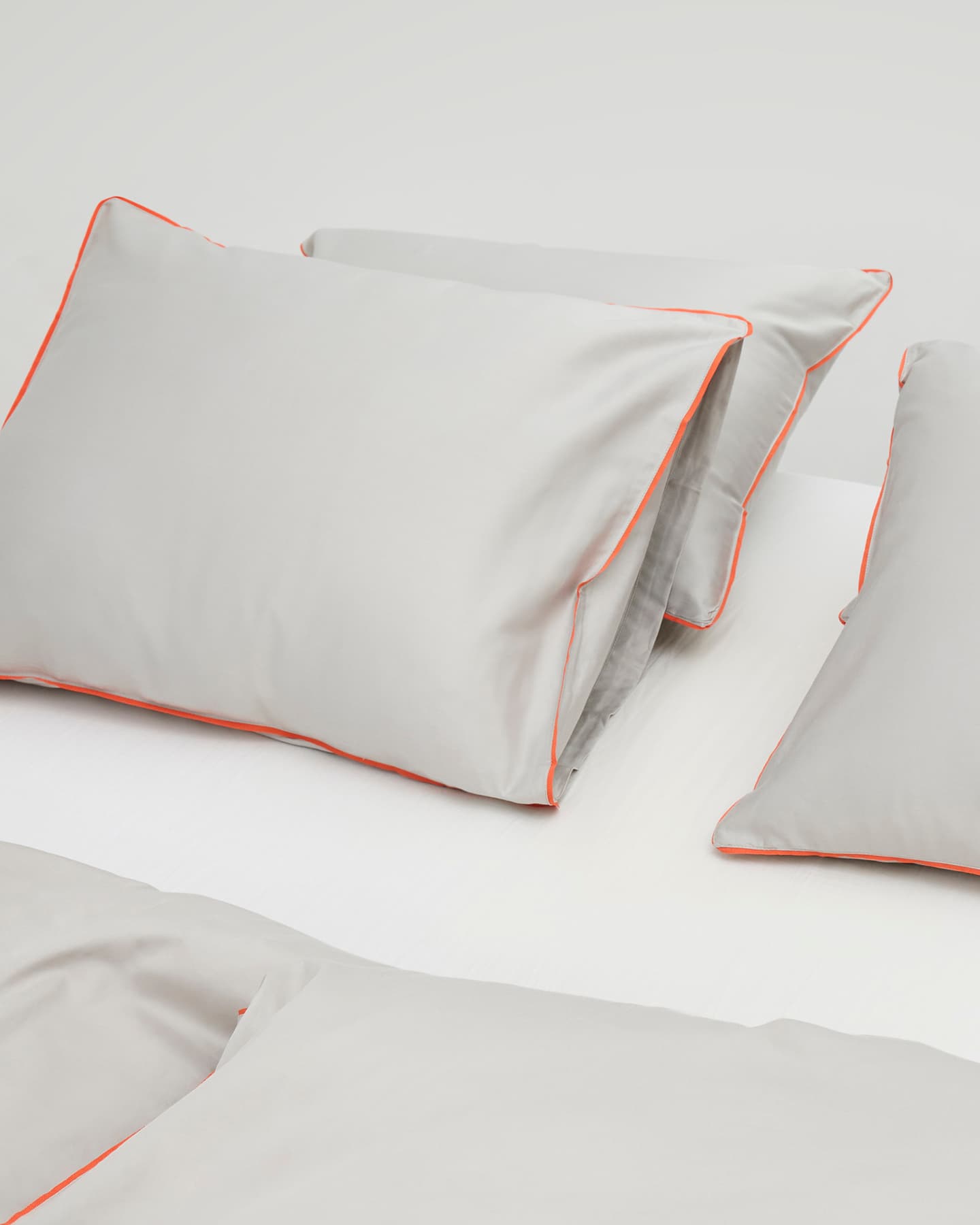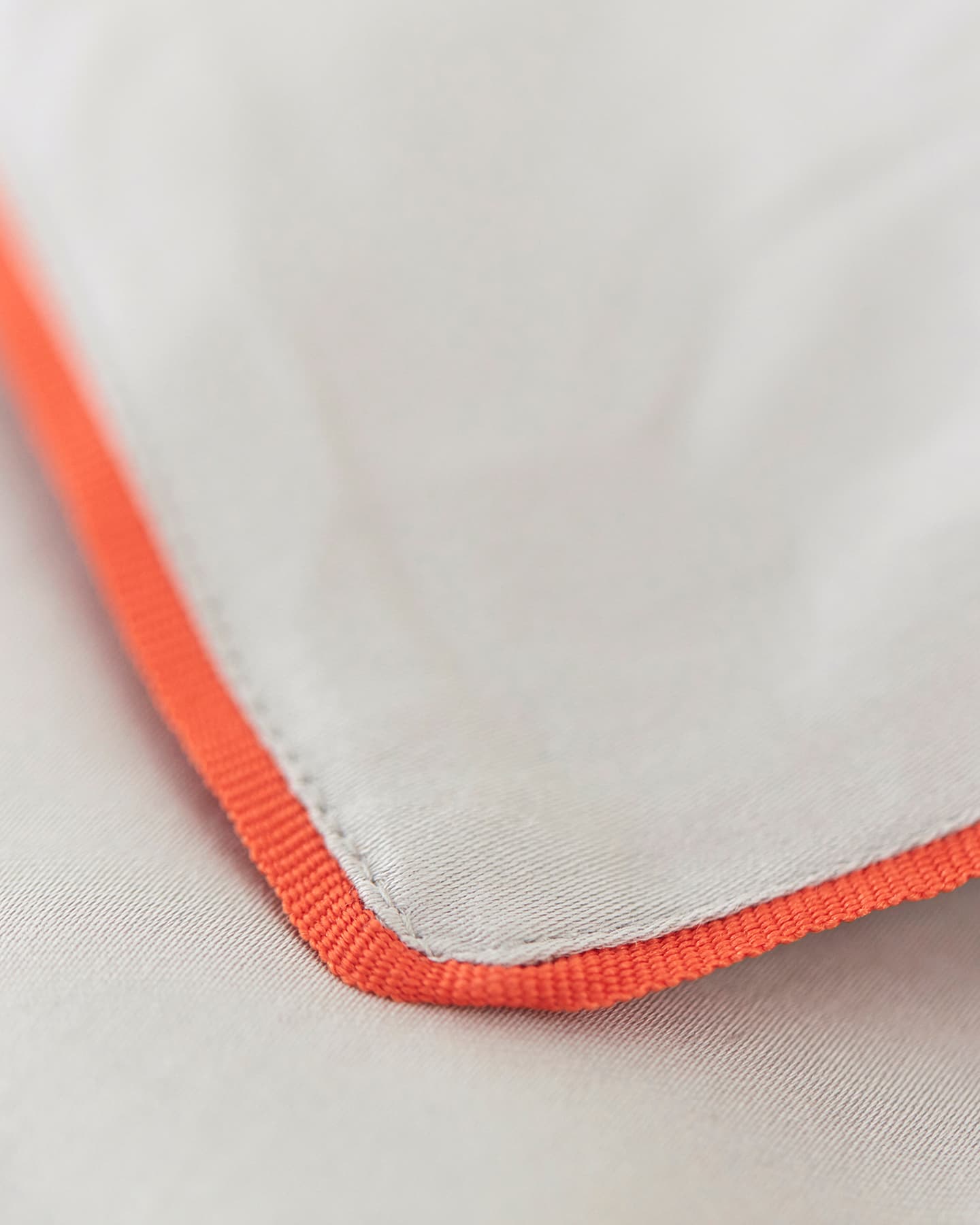 Strimma har en tunn passpoal i orange runt påslakan och örngott som är handsydd av erfarna skräddare. Passpoalen är gjord av återvunnen polyester. Tyget i satin skapar en mjuk och följsam känsla med vacker lyster.